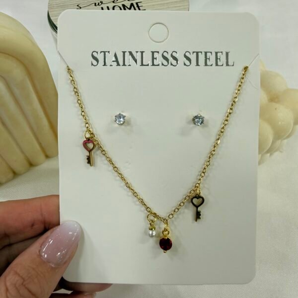 conjunto dorado 45cm con extensor extensible a 50cm, con dijes y aros. Se envia un color de cubic de los de la galeria.