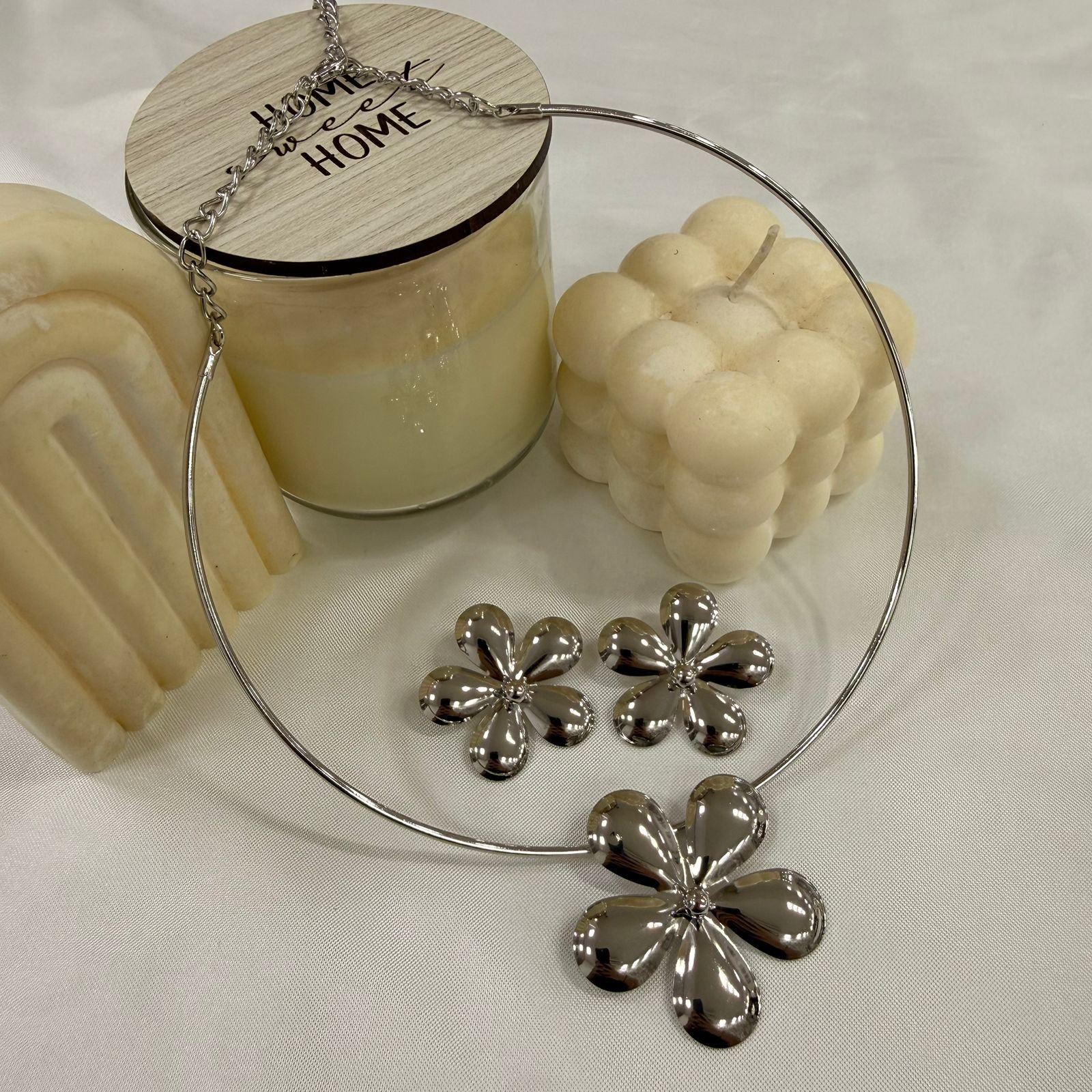conjunto plateado con aros modelo flor