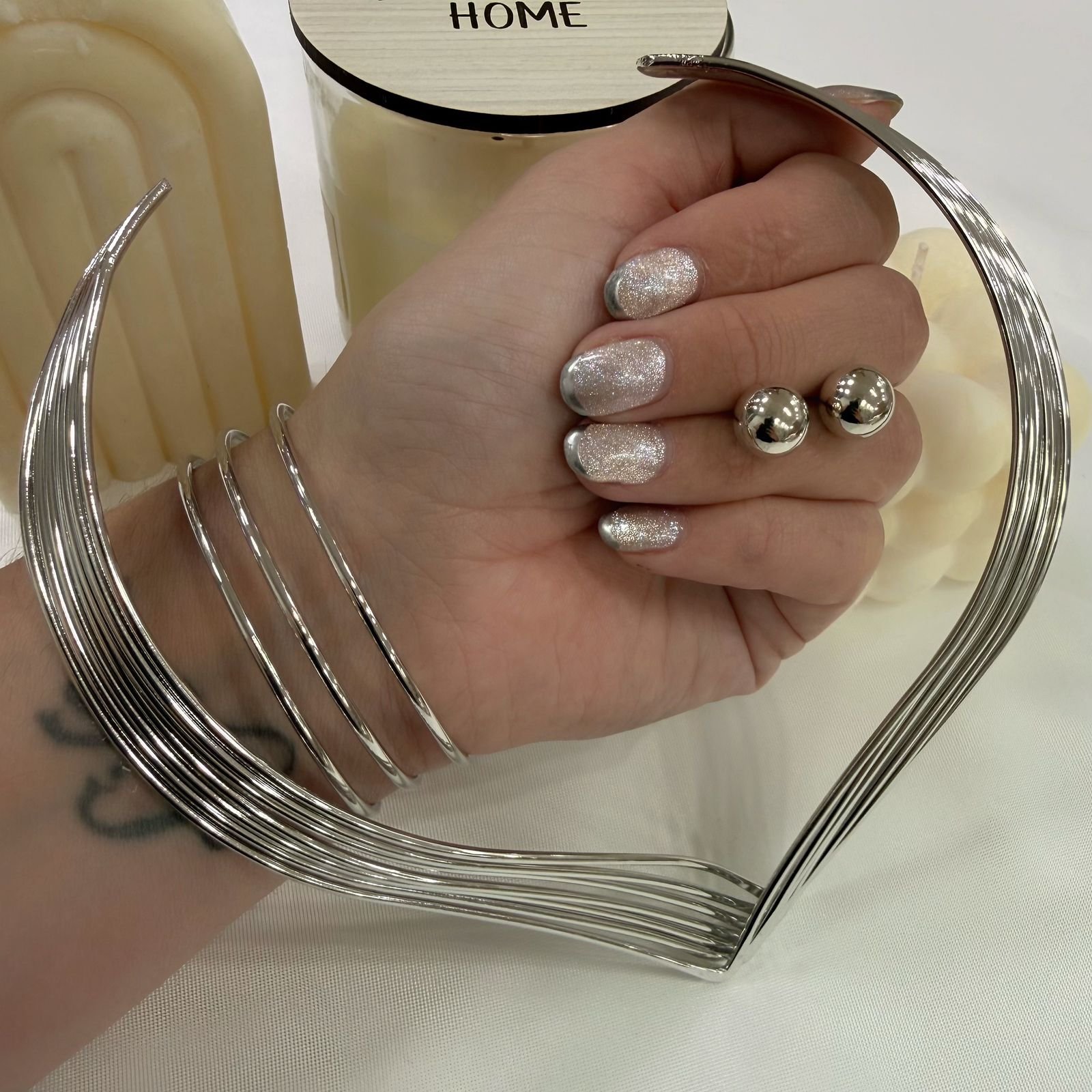 conjunto plateado con aros y esclava modelo V