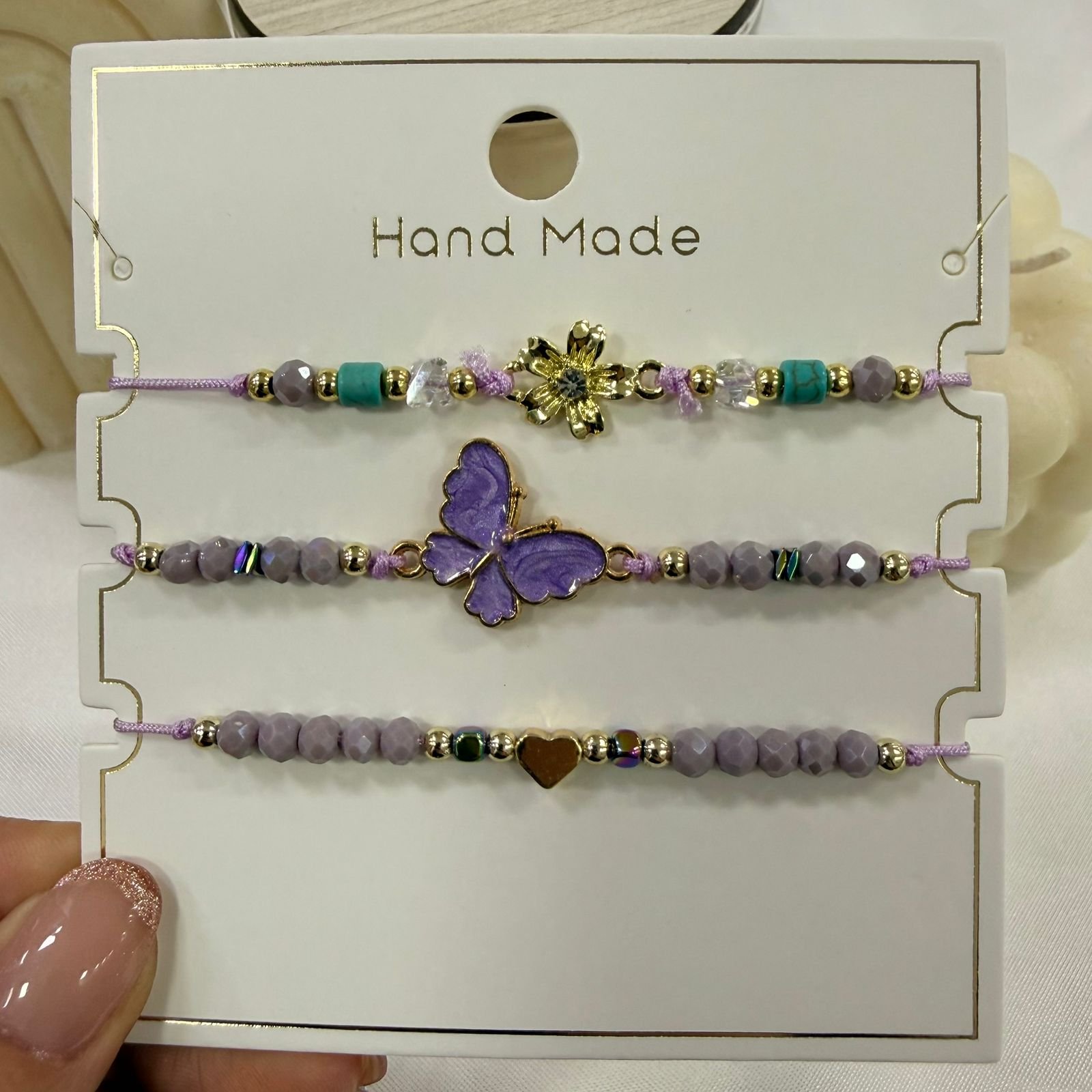 set x 3 pulseras extensibles encartonadas mariposa lila