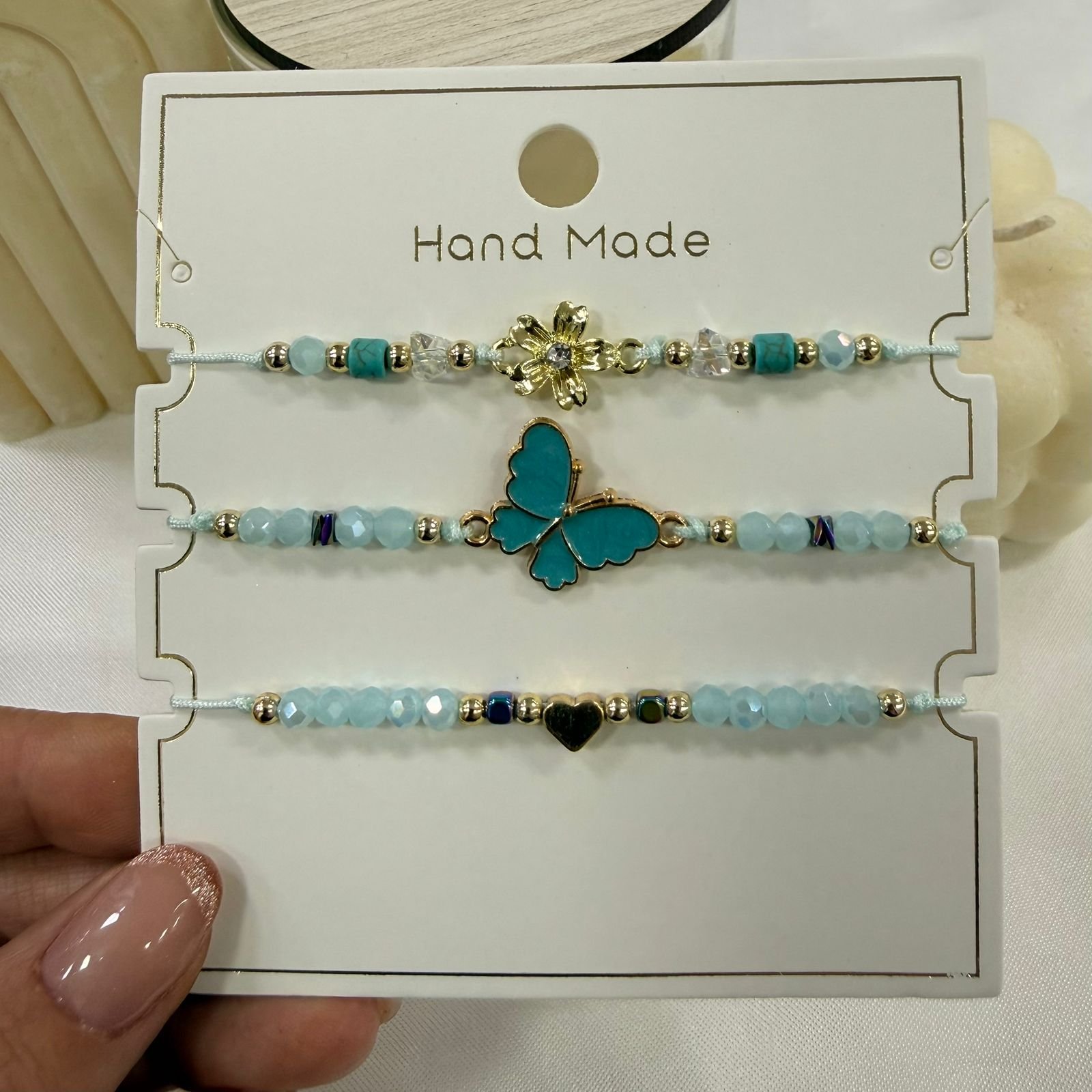 set x 3 pulseras extensibles encartonadas mariposa turqueza