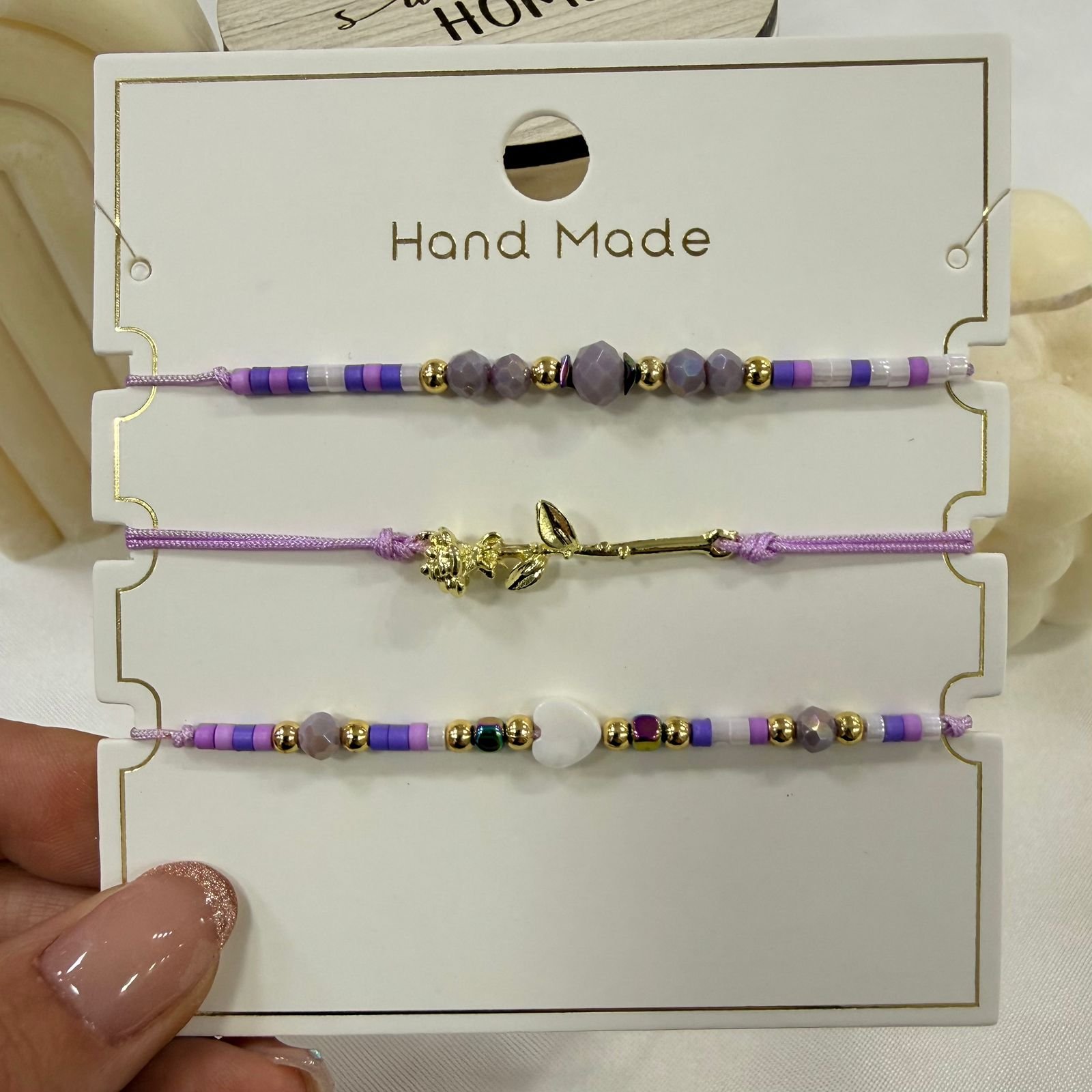 set x 3 pulseras extensibles encartonadas rosilla lila